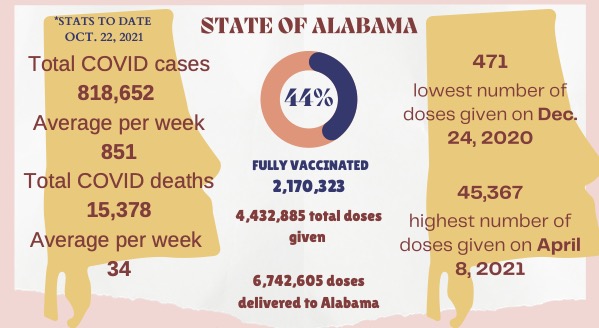 As of Oct. 22, statewide COVID cases totaled over 800,000 and over 15,000 deaths. USA Facts website for Alabama statistics can be found here.