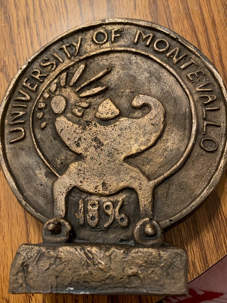 On the bottom is a handmade bronze sculpture to commemorate the 125th anniversary of the University of Montevallo. On the top is Nelson Grice, the UM alumnus who created the piece. On the bottom is a handmade bronze sculpture to commemorate the 125th anniversary of the University of Montevallo.
