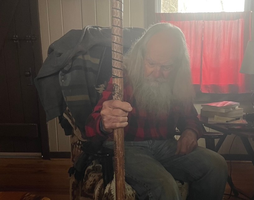 “I mean the guy who was most excited for me to break the record was the guy I took it from,” Sunny said. The record for the oldest person to ever through-hike the Appalachian Trail was set by Gray Beard set the record in 2018 and beaten by Sunny in 2021. When he completed the final summit in Maine, Gray Beard was waiting for him with a gift. Gray Beard had carved a hiking stick with the phrase: “Nimblewill Nomad, the oldest thru-hiker ever” into it.