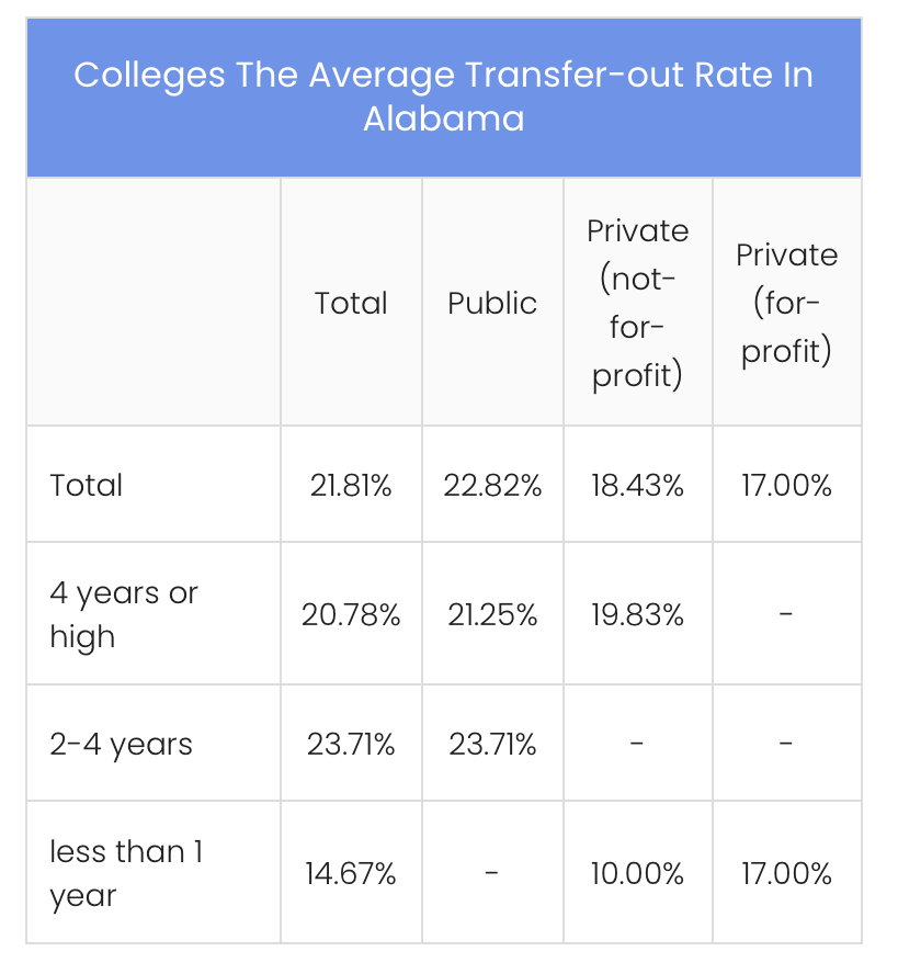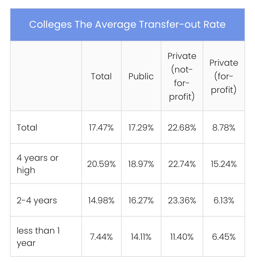 A study from University Stats: College Statistics based on the 2019-20 academic year shows that in the U.S.,the average transfer-out rate of college students being around 17% between private and public colleges.
