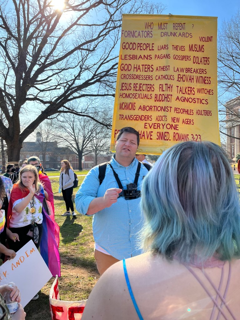 They waited for Luke Beets, a preacher who had spoken on campus the day before. Beets came to the campus on Feb. 8 with a sign calling several groups of people to repent. In a Facebook post, Beets announced he would return to campus on Feb. 9.