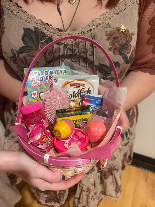The two chapters got together and packed the baskets with items like coloring books, crayons, slinkies, toy cars, sunglasses, hand lotions, and various snacks for the children.