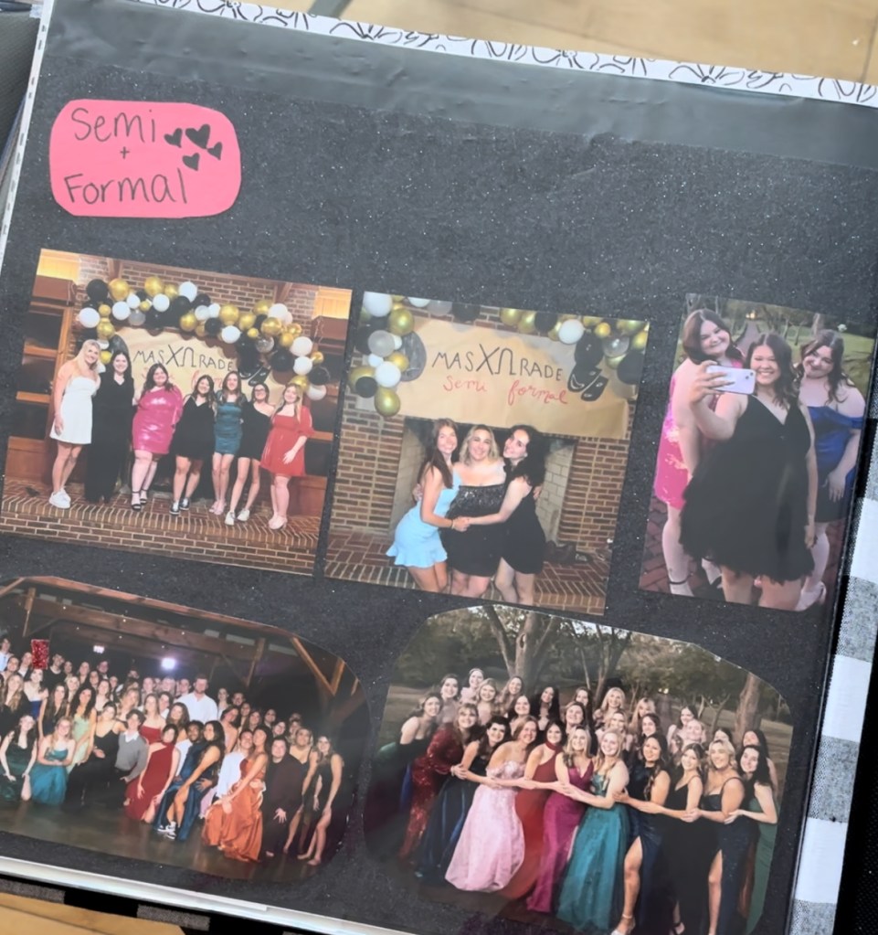 A page in a scrapbook commemorating Chi Omega’s formals and semiformals