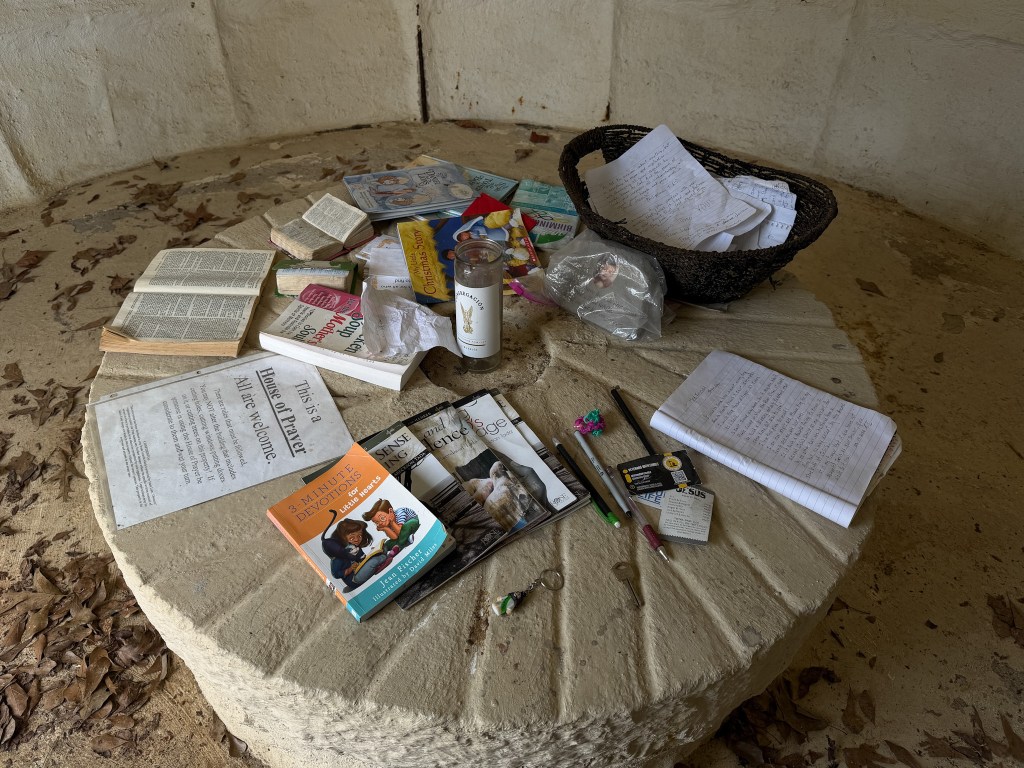 Upon the millstone sit many Bibles, books, devotions, Chick tracts and encouraging words left by visitors.