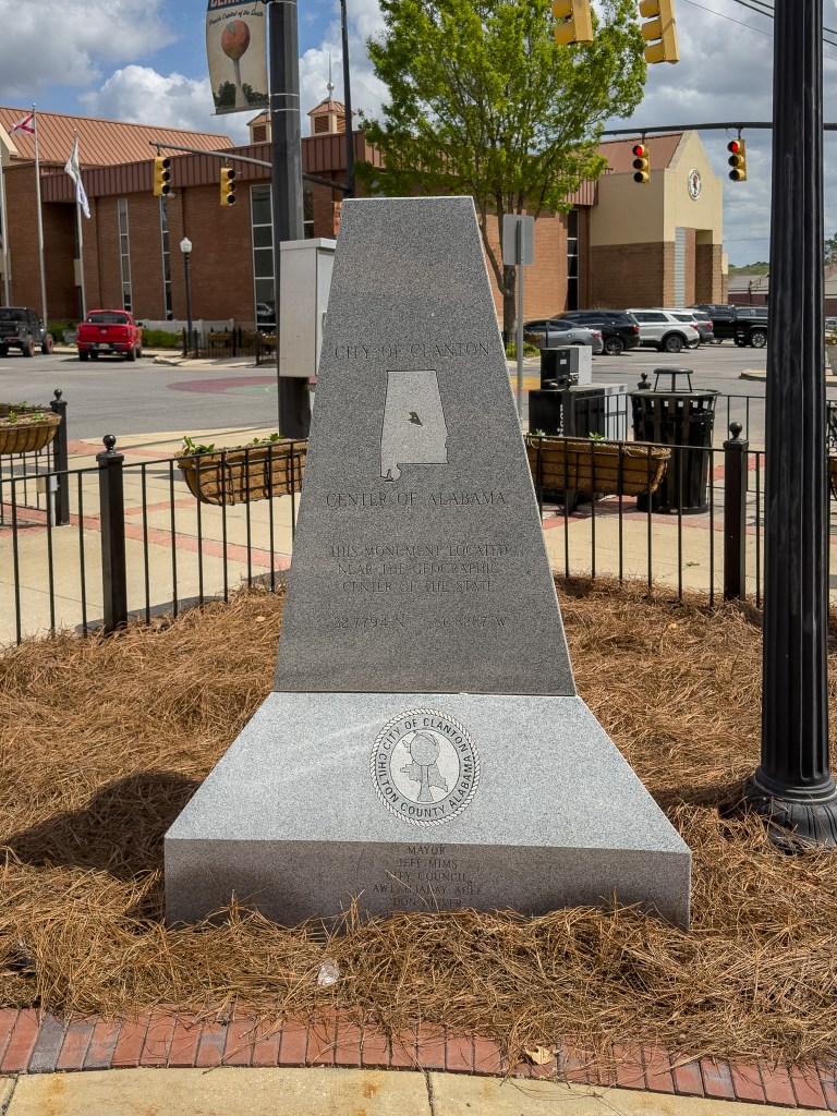 Engraved on the monument are the coordinates of the modern geographic center of Alabama: 32.7764, -86.8287.
